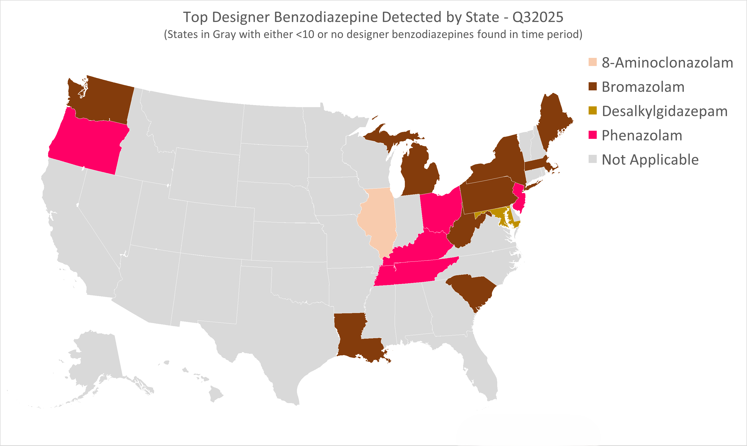 - For samples received in Q3 2025, Aegis identified phenazolam more often than other designer benzodiazepines in 5 states: Kentucky, New Jersey, Ohio, Oregon, and Tennessee.